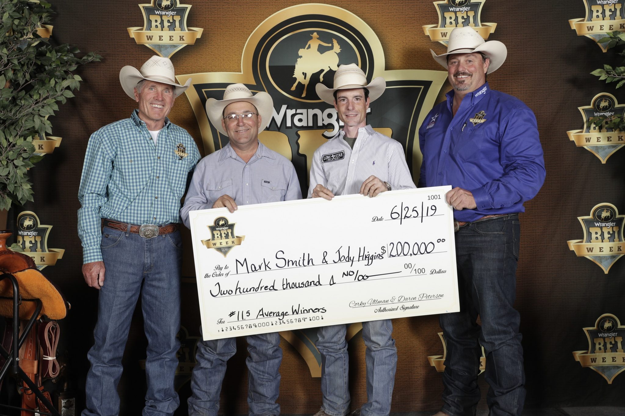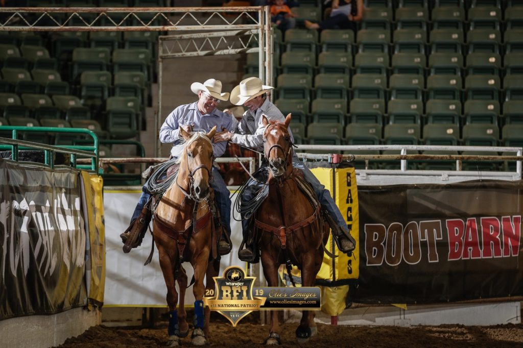 RENO, Nev. (June 25, 2019) – School teacher Jody Higgins of Monroe, Louisiana, and his horse-trading friend Mark Smith of Broken Bow, Oklahoma, teamed up at the last minute to split $200,000 in the Wrangler National Patriot #11.5 roping in Reno, Nevada.
