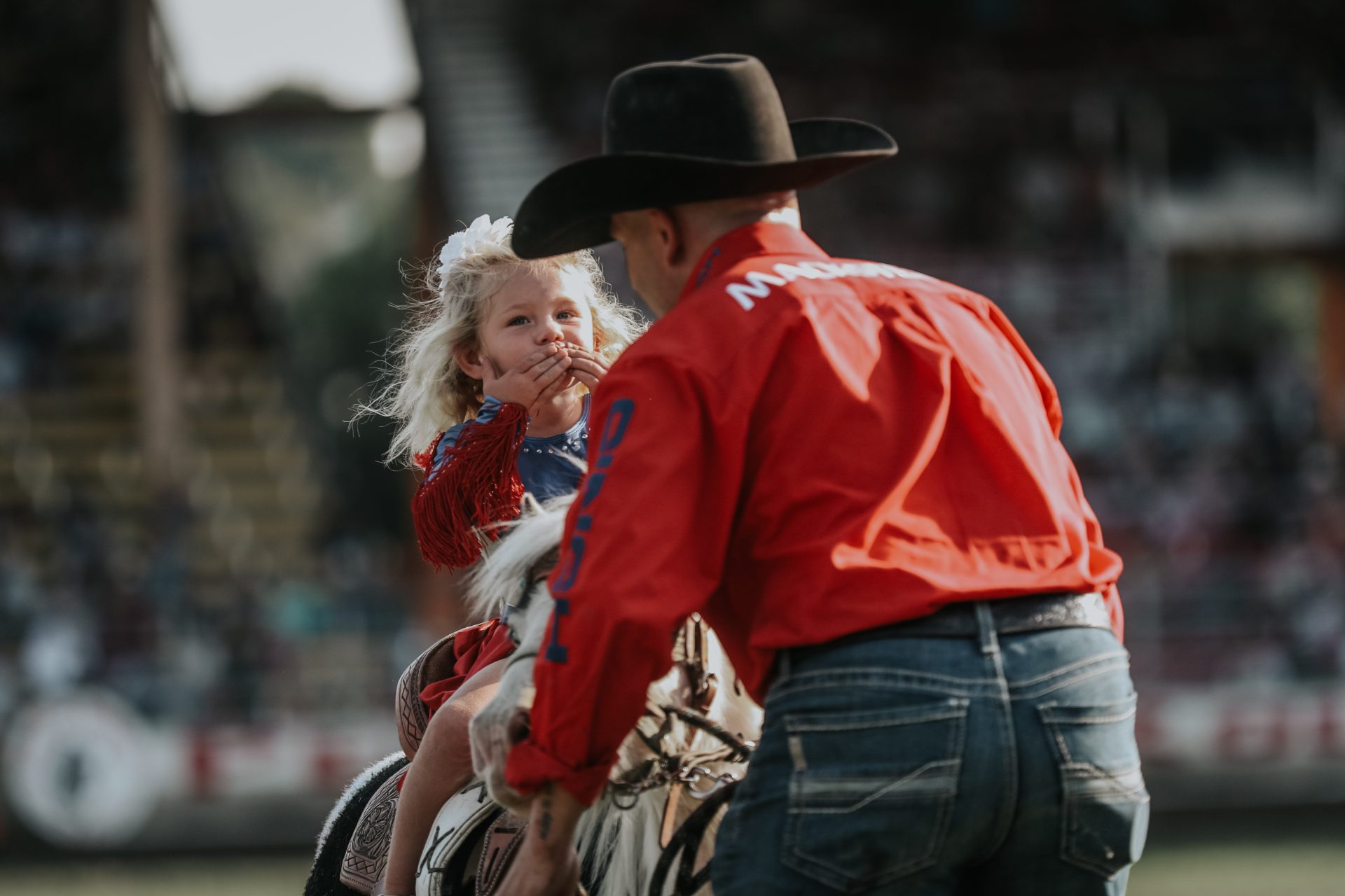 After having fun at that first performance, Shane has led Coulee into the arena to perform at many rodeos. Coulee will stand up, hang off the side of Phantom, wave at the crowd and show off her riding skills. Rodeo fans love seeing young people getting their start in the arena, and are especially fond of having Haley, Coulee and Shane appear together.
