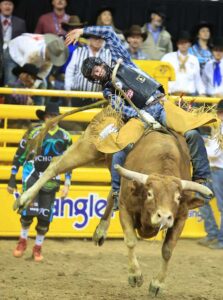 The Canadian tied the Round 9 record with a winning ride of 92 points on Beutler & Son Rodeo’s BDM Mud’s Killer Bee before 17,762 spectators Friday night at the Wrangler National Finals Rodeo presented by Teton Ridge at the Thomas & Mack Center.