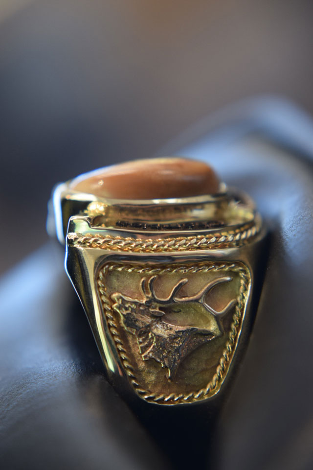 The custom-designed elk ivory ring valued at $2,699 includes 14 karat yellow gold with elk ivory. It features the outline of a royal bull elk head profile, carved and inlaid in gold. The words “Last Chance Stampede, Helena, MT, All-Around Champion” and the year are engraved on it.