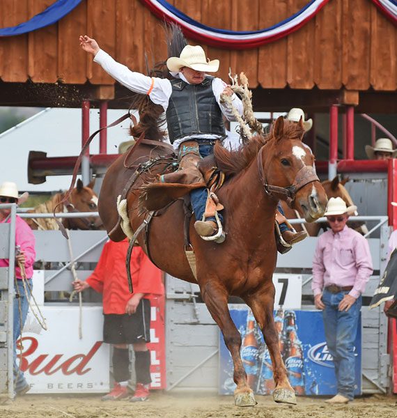 Other Red Bluff champions include three bareback riders who each scored 82 points: Clint Laye, Cochrane, Alb., Joe Gunderson, Gettysburg, S.D., and Jessy Davis, Power, Mont. Three saddle bronc riders also share the 2015 title: South Dakota cowboys Troy Crowser (Whitewood), Chuck Schmidt (Keldron), and Cort Scheer from Elsmere, Neb. Blair Burk, Durant, Okla. won the tie-down roping title, and Ann Scott, Canyon Country, Calif., was the barrel racing winner. Bull rider Wesley Silcox, Santasquin, Utah, clenched his event with an 89 point ride on Friday night.