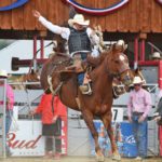 - (tie) Chuck Schmidt, Keldron, SD 83 points on Growney Bros. Rodeo’s Holy Hoppin Hell, Troy Crowser, Whitewood, SD, 83 points on Flying Diamond Rodeo’s Handsome, and Cort Scheer, Elsmere, NE, 83 points on Rosser Rodeo’s Blackhawk Blaze; 4. (tie) Jacobs Crawley, Stephenville, TX, Wade Sundell, Colman, OK and Spencer Wright, Milford, UT 80; 6. (tie) Taos Muncy, Corona, NM, Chad Ferley, Oelrichs, S.D. and Andy Clarys, 79 each.
