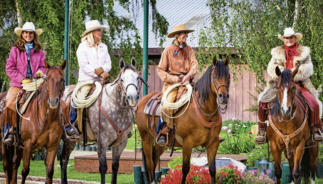 Audrey’s book club girls (they read and ride) left to right: Lisa Thompson, Kristin Reynolds, Sheila Varian, and Audrey Griffin at Sheila’s Ranch in Arroyo Grande – Kathryn Burke