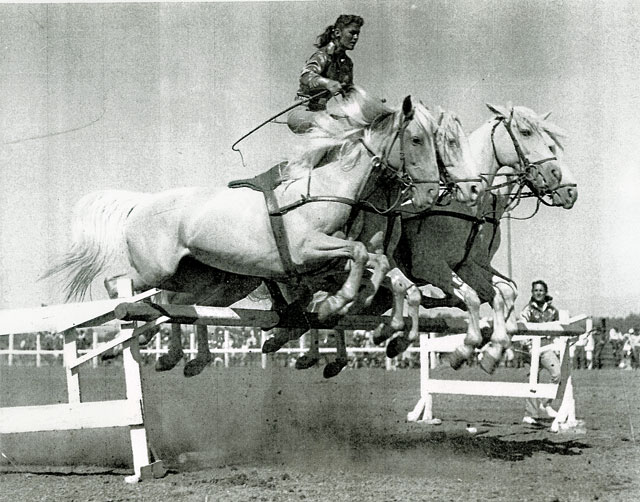 Audrey jumping four abreast performing at in Phoenix, Arizona with the Flying Valkyries. She drove the horses back into a standing ovation. – courtesy of the family