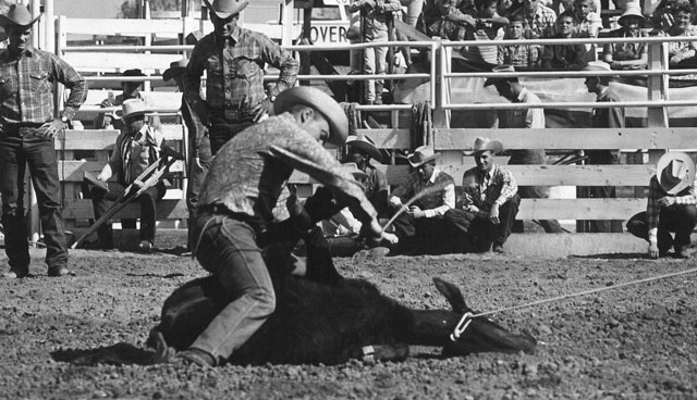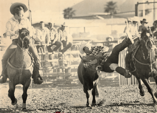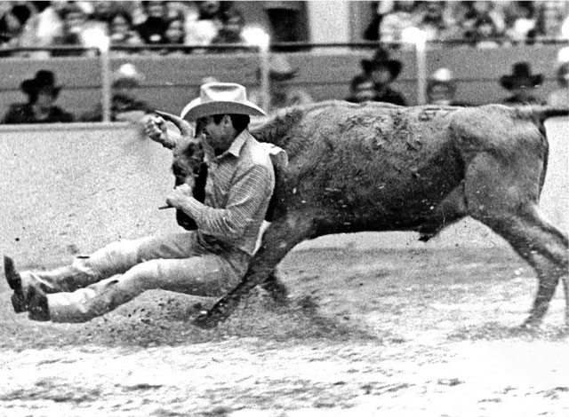 Rollie steer wrestling at the Silver Bird Hotel in 1980 with Jerry Jones hazing. It was a 5.5 second run. – courtesy of the family