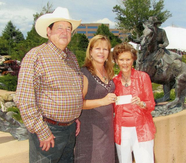 Rollie Gibbs (left) and Liz Kesler (far right) on behalf of the Cowboy Reunion present a check to Cindy Schonholtz (center) and the Justin Cowboy Crisis Fund – courtesy of the family