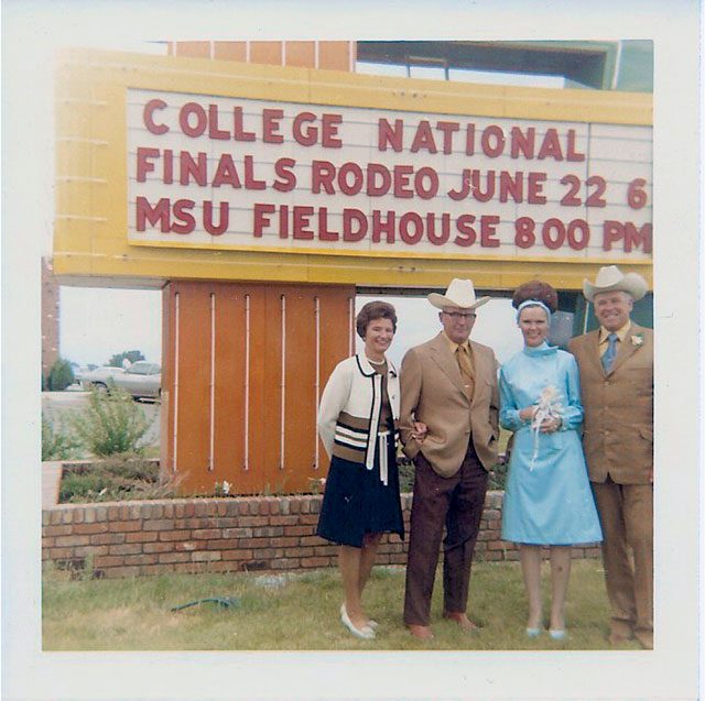 They married in Bozeman, Montana in 1971 during the NIRA (National Intercollegiate Rodeo Association) Finals. Those attending their wedding in the Methodist Church were Liz’s mother, and niece, Phyllis Jones, and good friends Bud and Anna Lee Purdy. Liz remembers that Byron Walker and Martha Tompkins were among the college students competing at the rodeo. She assisted announcer Don Harrington by identifying the various college contestants and what colleges they represented.
