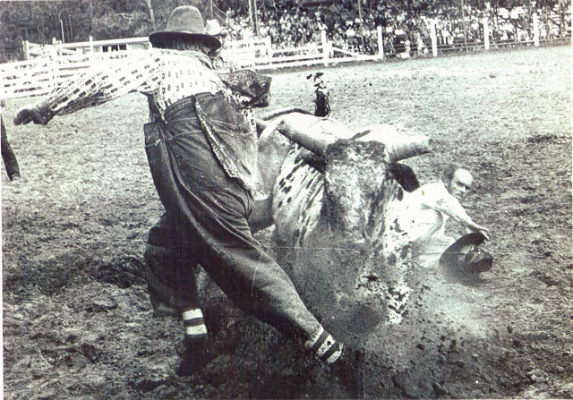 He joined the Rodeo Cowboys Association in 1961 and booked 21 rodeos including Walla Walla, Ellensburg, Pendleton and Lewiston, the Big Four in the northwest.  They had watched him on television earlier, and knew how good he was.  From that introduction to professional rodeo he was hired from one end of the country to the other, and border to border.  He spent ten years traveling with Junior Meek, a bullfighter, too.  In 1971 he worked the National Finals Rodeo, and again in 1977.  In 1979 he helped put the Wrangler Bullfights together and judged various events including the 1981 Wrangler Bullfight Finals.  He also worked the National High School Finals three times, the National Intercollegiate Rodeo Association Finals in 1969, and received numerous awards along the way.  He retired in 1981 at Pendleton, Oregon, where he fought bulls for 19 years.