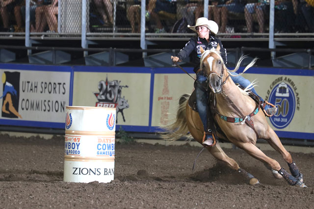 Not to be outdone by the cowboys, barrel racer Hailey Kinsel repeated as the gold medalist at the Days of ’47 Cowboy Games & Rodeo. Kinsel of Cotulla, Texas, and her mount DM Sissy Hayday “Sister” turned in a lighting fast 17.09 second run to lead the way and continue their winning ways.