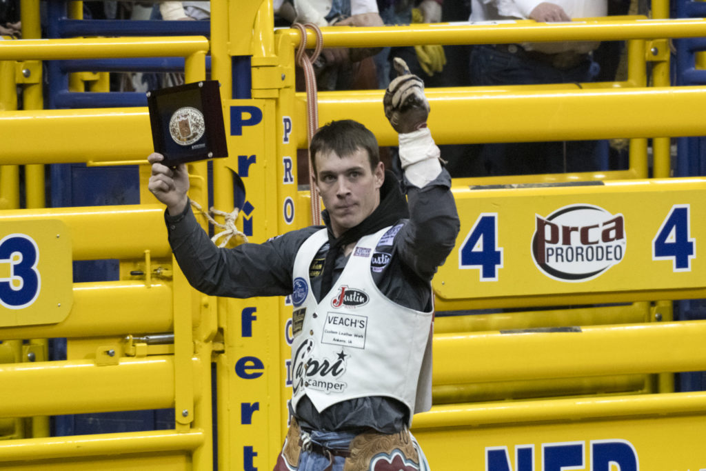 Bareback riding: (tie) Steven Dent on Pete Carr’s Classic Pro Rodeo’s Scarlett’s Web and Mason Clements on Pickett Pro Rodeo’s Utah Top Flight, 88 points, $23,481 each; 3. Bill Tutor, 87.5, $15,654; 4. (tie) Richmond Champion and Ty Breuer, 86.5, $8,885 each; 6. J.R. Vezain, 86, $4,231; 7. Tim O’Connell, 85.5; 8. Caleb Bennett, 84; 9. Tanner Aus, 82.5; 10. Clayton Biglow, 82; 11. Orin Larsen, 81.5; 12. Wyatt Denny, 81; 13. R.C. Landingham, 79.5; 14. Jake Vold, NS. Jake Vold (out for the last two rounds after dislocated knee). Average standings: 1. Tim O’Connell, 853.5 points on 10 head; 2. Richmond Champion, 847.5; 3. J.R. Vezain, 842; 4. Caleb Bennett, 835.5; 5. Tanner Aus, 829.5; 6. Steven Dent, 825; 7. Ty Breuer, 814.5; 8. Bill Tutor, 802.5. World standings: 1. Tim O’Connell, $371,416; 2. Richmond Champion, $268,511; 3. Tanner Aus, $235,715; 4. J.R. Vezain, $220,831; 5. Clayton Biglow, $200,557; 6. Caleb Bennett, $195,088; 7. Jake Vold, $185,706; 8. Orin Larsen, $171,009; 9. Steven Dent, $170,709; 10. Mason Clements, $166,486; 11. Bill Tutor, $166,398; 12. Jake Brown, $161,866; 13. Ty Breuer, $145,645; 14. Wyatt Denny, $140,084; 15. R.C. Landingham, $106,031.