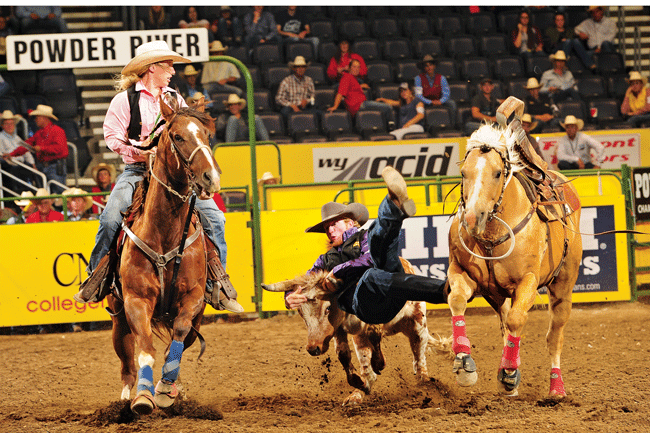 Having watched more steer wrestling than any TV show, Lindsay took to hazing naturally. By fall of 2015, her senior year, she was hazing for eight of the steer wrestlers, and hazed for several of them at the CNFR two years in a row. “I’ve chute dogged a few times, but never gotten off a horse. But if I could bulldog, I definitely would,” says Lindsay. “The guys will come ask me which are the stronger steers and how the last guy did on the one they drew. I pay attention, not just for them, but for myself so I know what moves the steers make and how to make the best haze. I was the only girl hazing in CSI, but there’s another girl in Rocky Mountain region who started doing it as well.”