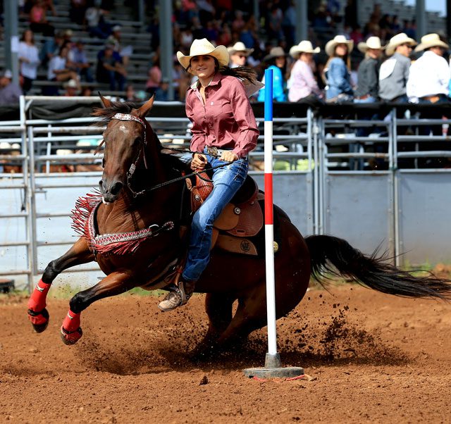 Brooklyn Gunter spends five nights a week in the practice pen with her six siblings; Lexi (17), Gabby (13), William (10), Presley (8), Sianna (6), Jesse (4),  and 42 cousins. “We don’t cook Friday or Saturday, because of the rodeos. Maw Maw cooks for about 60 of us, and we all eat at the arena, and then we practice.” The 15-year-old from Sulphur, Louisiana, got a new horse this year for pole bending and they are taking home the saddles. She won every round and the short go in the IFYR pole bending riding the famous, Blaze, a grade mare that was bought at the sale barn for $125. She purchased her from Skylar Ragan, who trained the horse. “The first time I got on him, I was really scared,” she said. “We had a 19.6 – it worked out good.” Blaze knows her job and gets nervous before the run. “It takes a while to get her in the arena, but once she sees the poles she’s fine. I don’t breathe through the entire thing, it happens so fast.” The whole family moved camp from Shawnee to Gillette, Wyo., for the National High School Finals, where Brooklyn is keeping up the winning streak with a 20.0, currently leading Round 1. “My horse wouldn’t go in the arena, and they started the clock to disqualify me, so I got nervous.” She was able to get Blaze going, but ended up doing the entire run without stirrups.