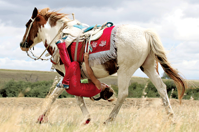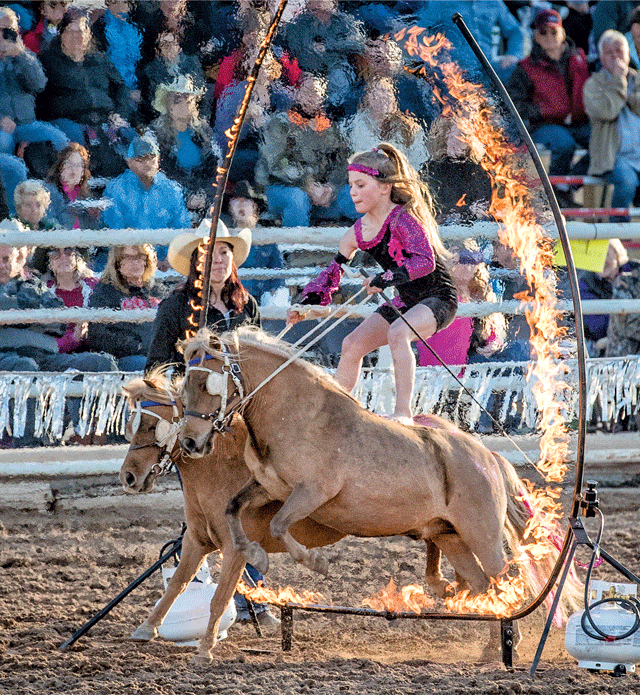 Pipes received her first formal training in trick riding from Rae-Lynn Armstrong, who was Madison MacDonald Thomas’s partner in Magic in Motion. “I met her through that,” explained Madison, who has been working with her for four years now. “She’s determined with a lot of try and a lot of heart. She’s very fun to teach – you can throw anything at her and she’ll try it. For someone as young as she is and the pressure of the shows we put her under, it’s incredible what she can do and handle.” Madison, who has been trick riding for 20 years, teaches trick riding from coast to coast. “The number of trick riders is growing,” she said. “The ‘trick’ is learning how to use your body, and Pipes is a natural – I love that little girl – she’s a fun one.”