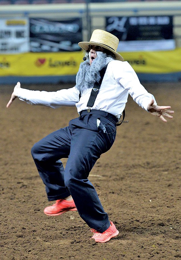 Dave “Showtime” Meyer danced his way to IFR46 Comedy Act Showcase Champion during the IPRA finals in Oklahoma City. Known for his YouTube videos featuring the Horse Screamer and an Amish man, Jacob, the rodeo clown from Jonestown, Pa., was competing in his first IPRA event with six minutes in the arena for his act. One of ten contestants entered, including Hollywood Harris, Dave knew his work would have to be distinctive. He pulled out one of his favorite characters, Jacob the Amish man, and shuffled into the arena, barefoot and bewhiskered. By the end of the act, Jacob was dancing in a pair of magical shoes, and Dave went home with the championship buckle. “It was cool to walk away with the buckle,” says Dave. “The announcer I worked with, Don McGee, also won first place, so that was pretty neat! We laid out a bit of a plan – I don’t like things to be scripted – and we rolled with it!”