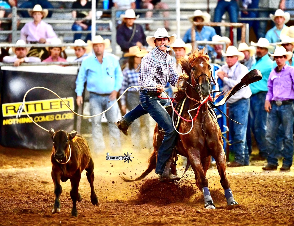 Calf Roping: Trevor Hale, Perryton TX  25.7/3 $1,260.11; Dylan Hancock, San Angelo TX  25.8/3 $1,095.75; Cash Fuesz, Eureka KS  27.9/3 $931.39; Mason Appleton, Copan OK  28.0/3 $767.03; Jake Holmes, Mulberry KS  28.6/3 $602.66; Houston Shipley, Copan OK  29.3/3 $438.30; Mason Theriot, Poplarville MS  29.9/3 $273.94; Cash Goble, Dalton GA  30.3/3 $109.58